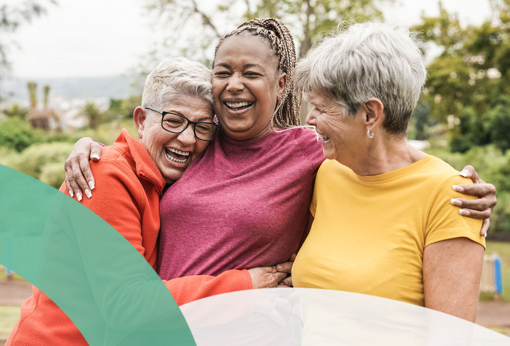 Three women happily embrace outdoors, showcasing supportive friendship.